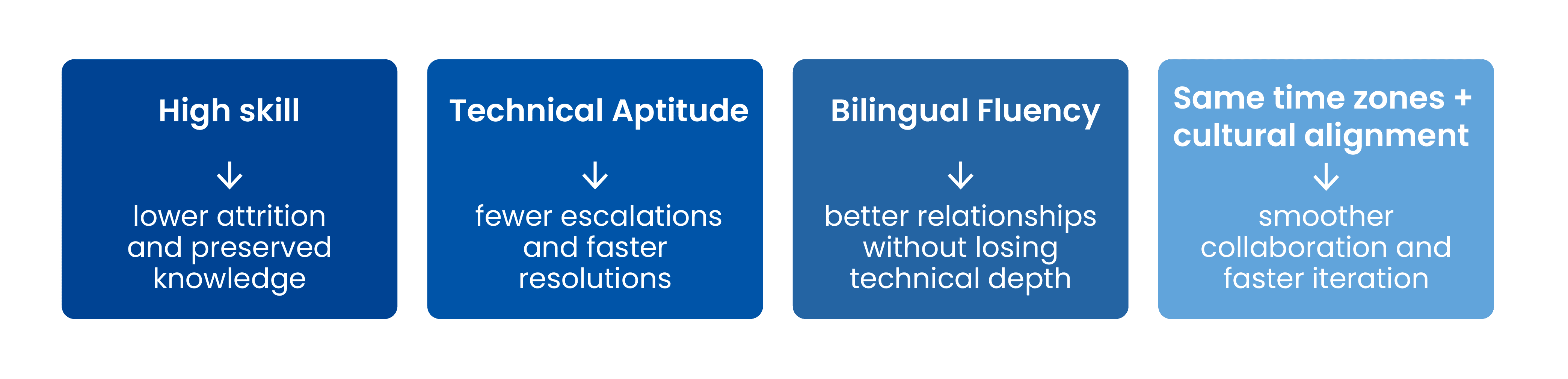 When your team works in similar time zones and understands your work culture, you get faster decisions, fewer misunderstandings, and better outcomes for customers. It also makes collaboration with product and engineering significantly smoother.